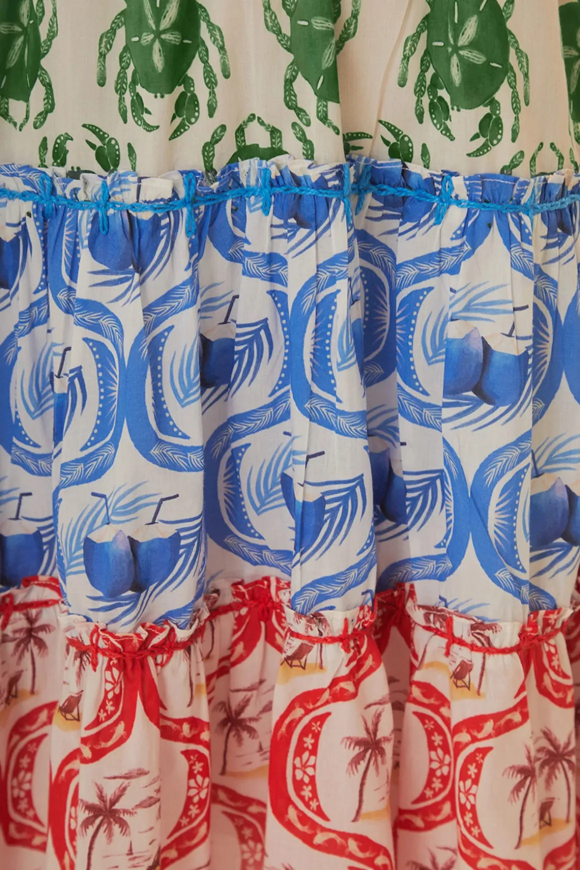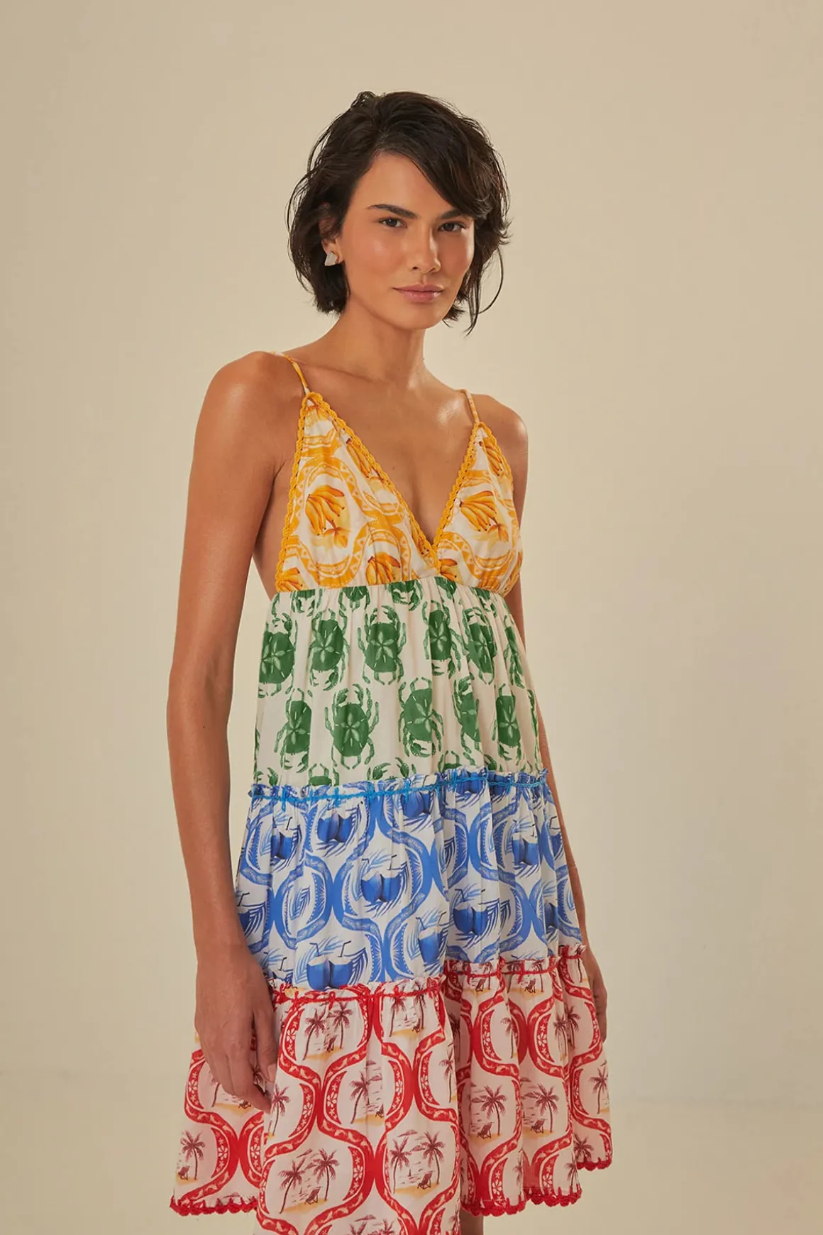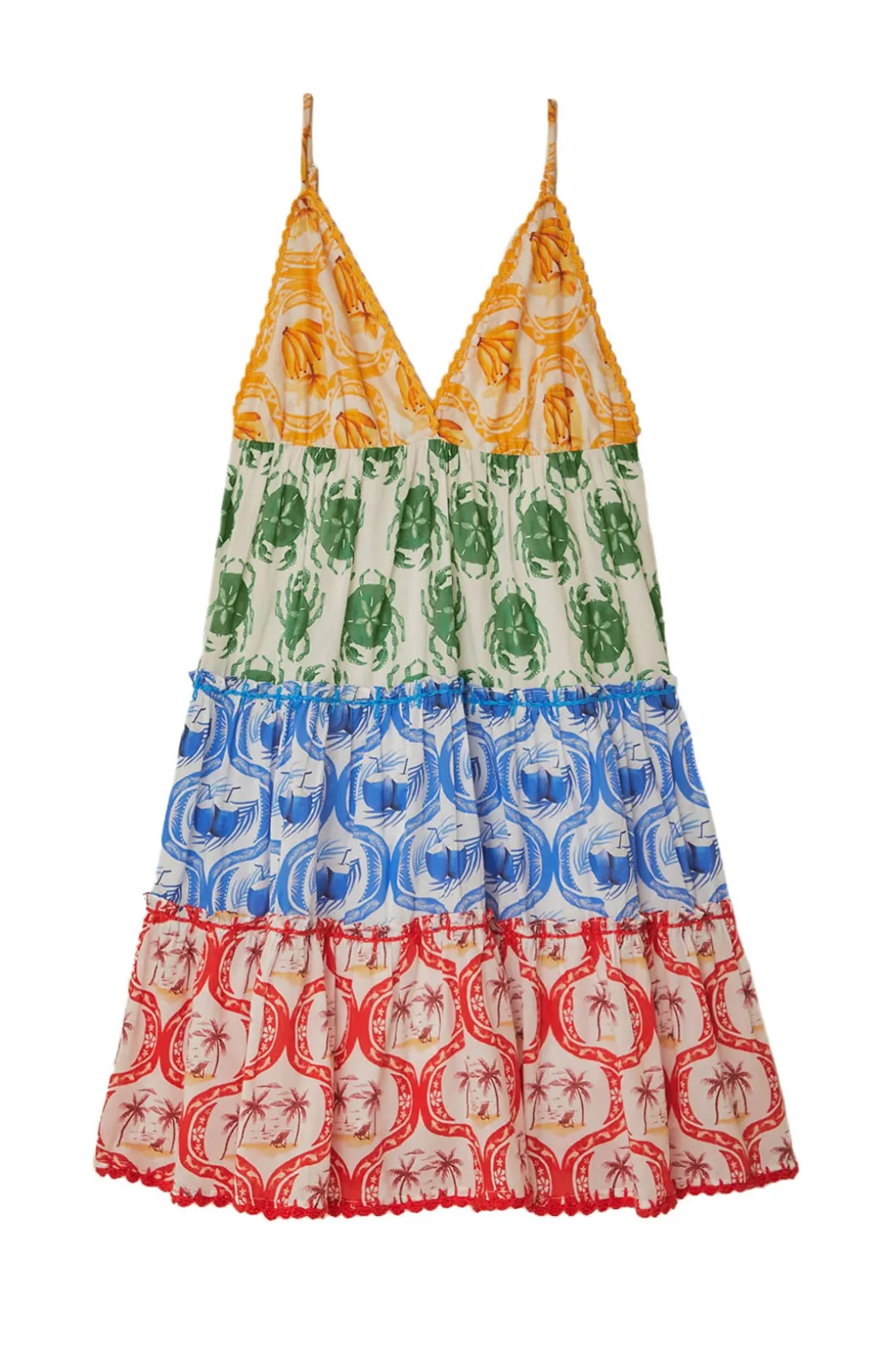 Summer mix mini dress features multicolored mixed prints, adjustable straps, and tiered skirt.