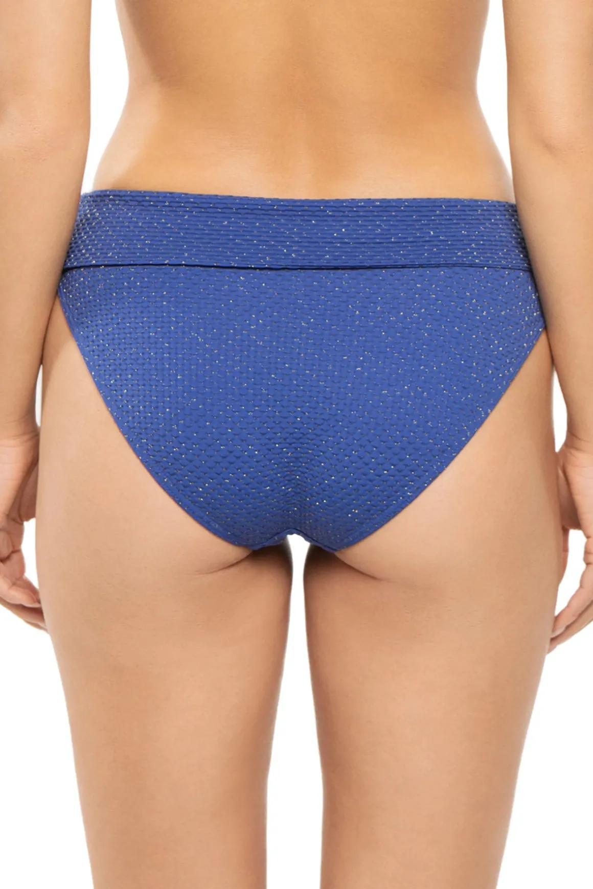 Sydney hipster bikini bottom features a recycled pique textured fabrication, a foldable waistband, and offers moderate coverage.