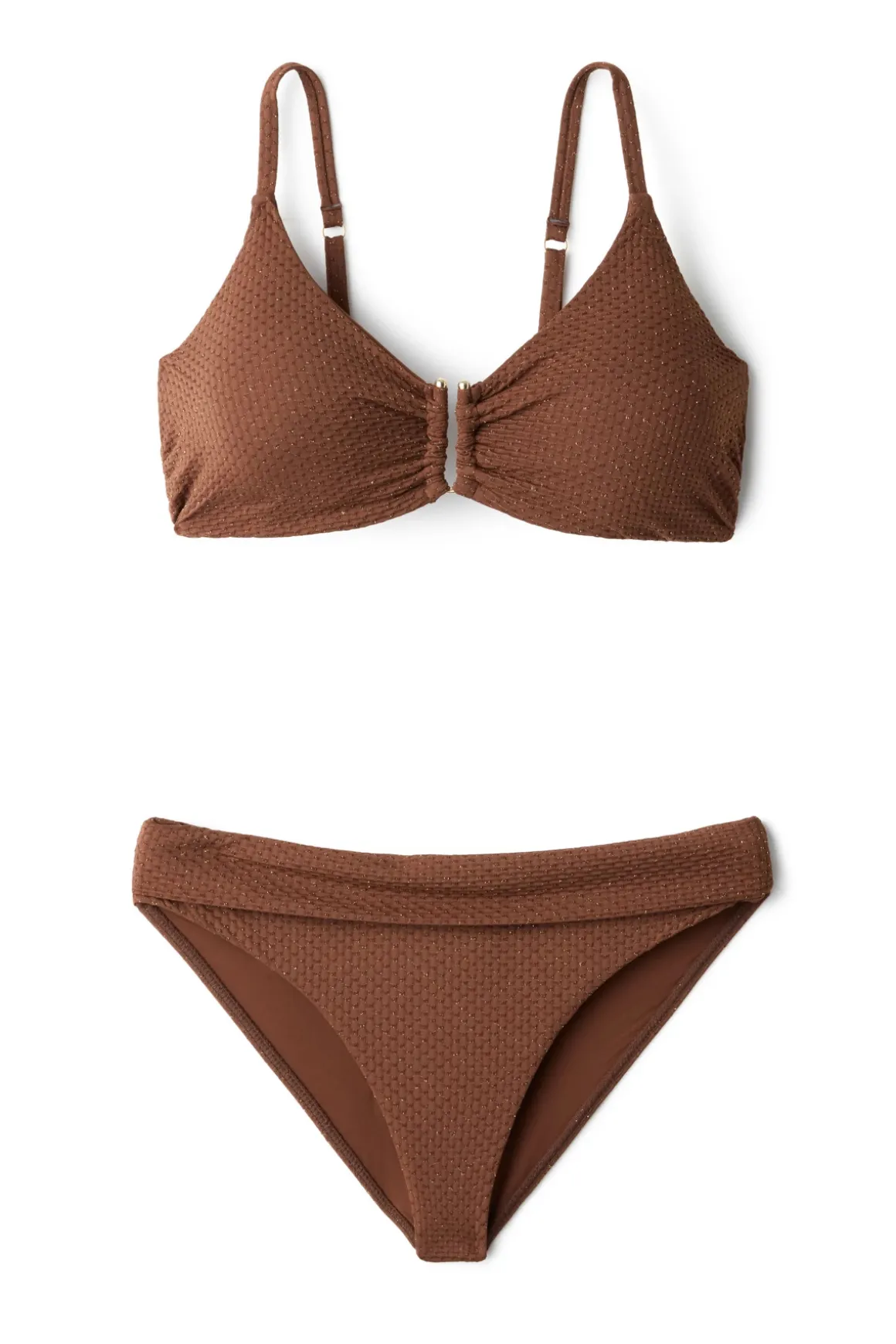 Sydney hipster bikini bottom features a recycled pique textured fabrication, a foldable waistband, and offers moderate coverage.
