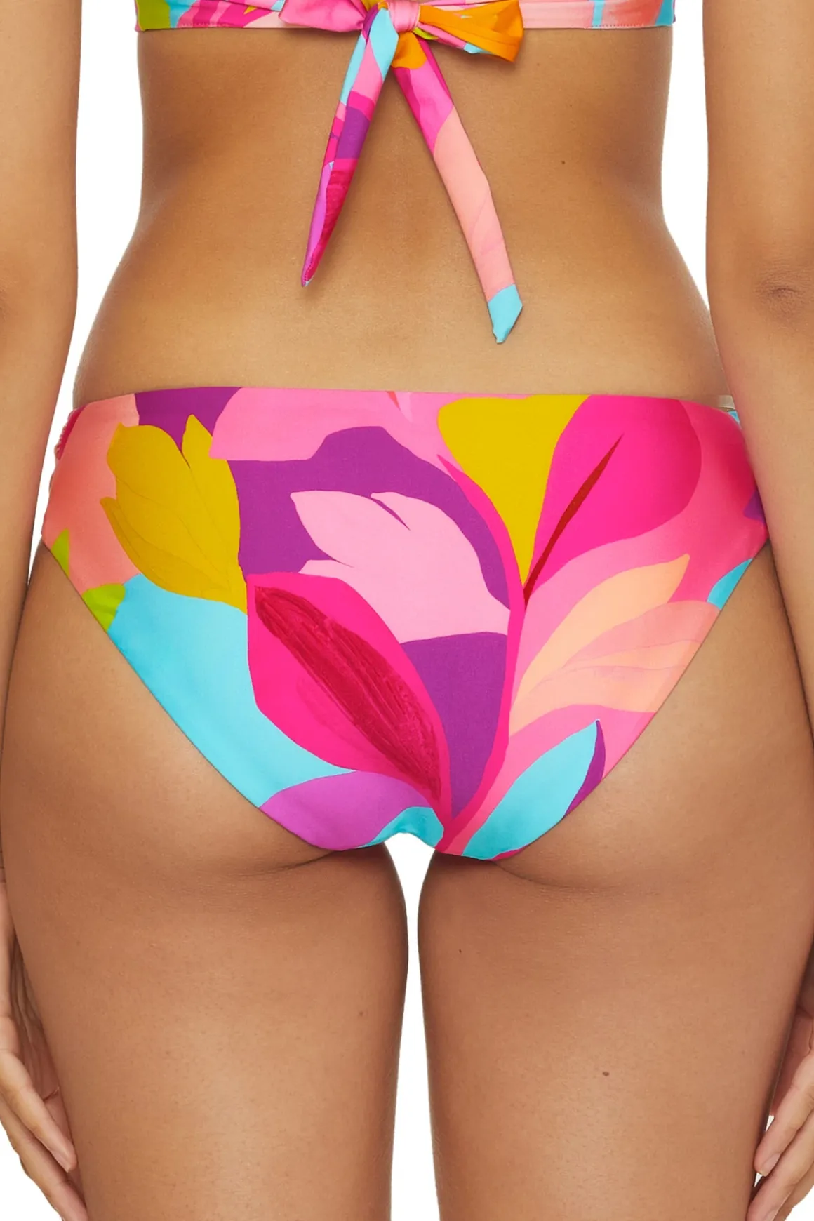 Hipster bikini bottom features a bright floral print and shirred tab sides.