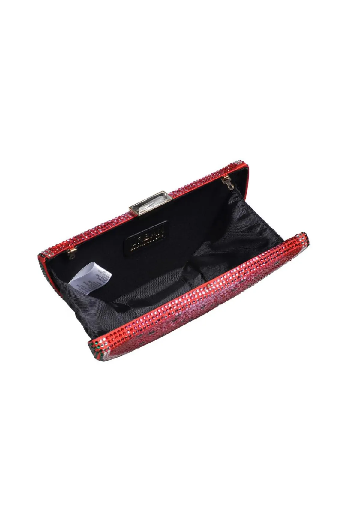 Tabitha clutch features eye-catching details, rhinestone embellishments, a detachable chain strap, and a top clasp closure.