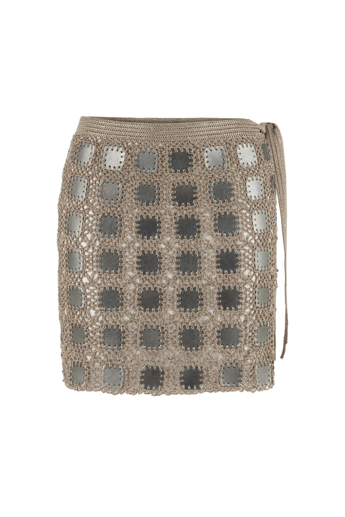Terra mini skirt features a fusion open weave crochet and faux metallic leather. Offers a side tie to adjust the fit.