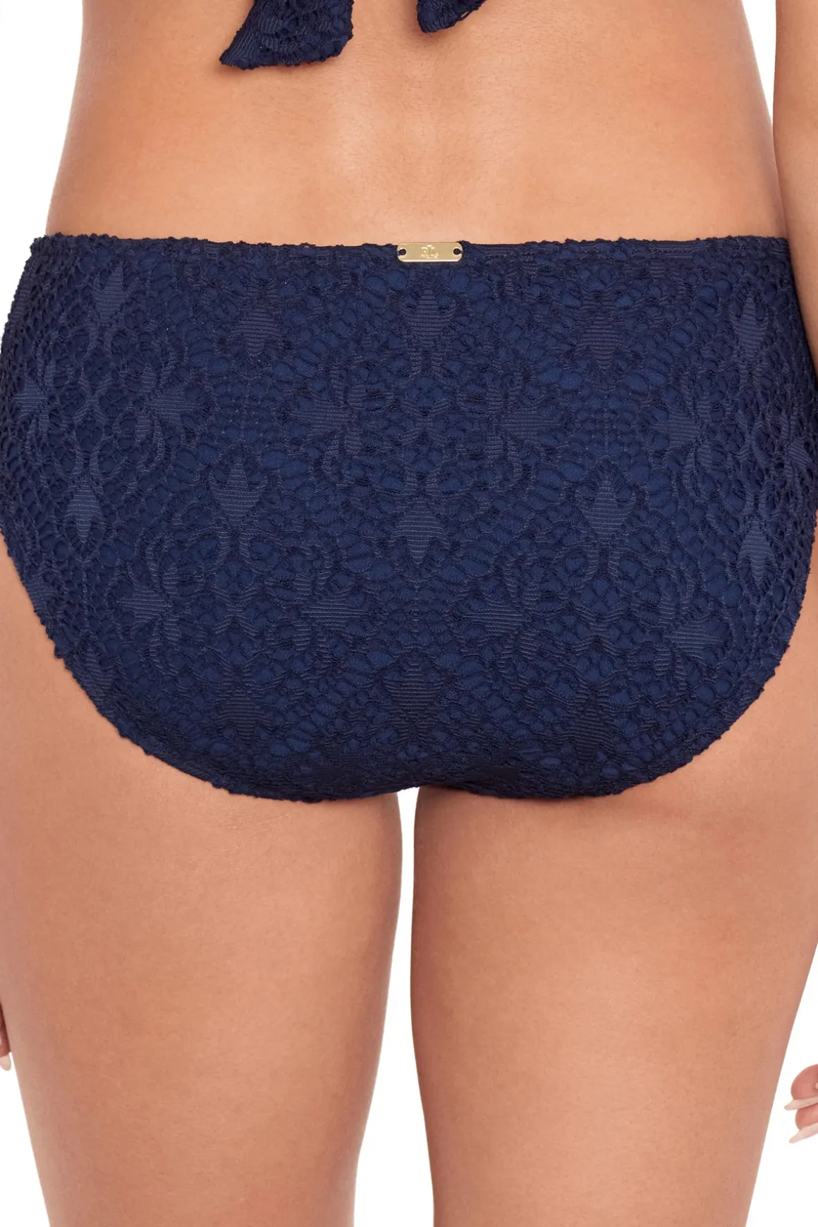 Bikini bottom features textured crochet fabric and a side ring detail. Offers full bottom coverage.