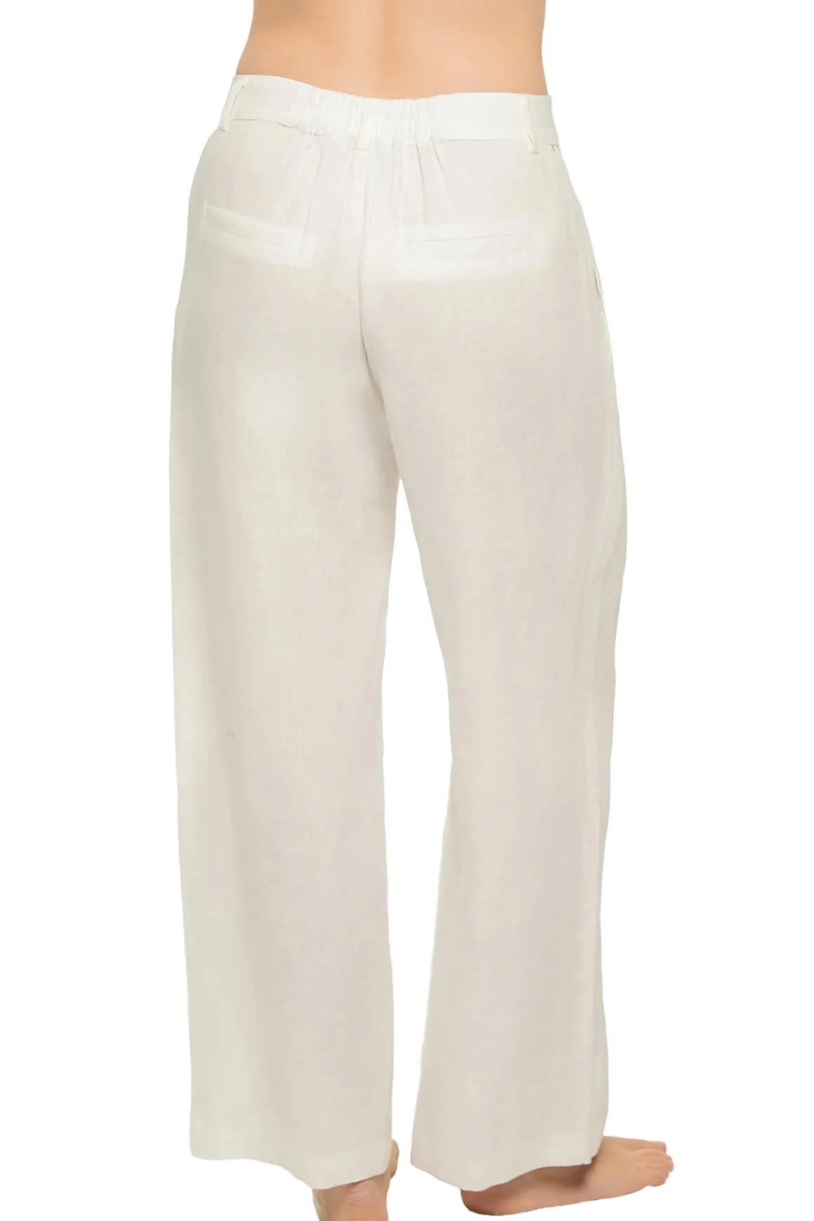Pants feature a mid-rise waist, belt loops, front button closure, elastic back waistband, and side pockets.