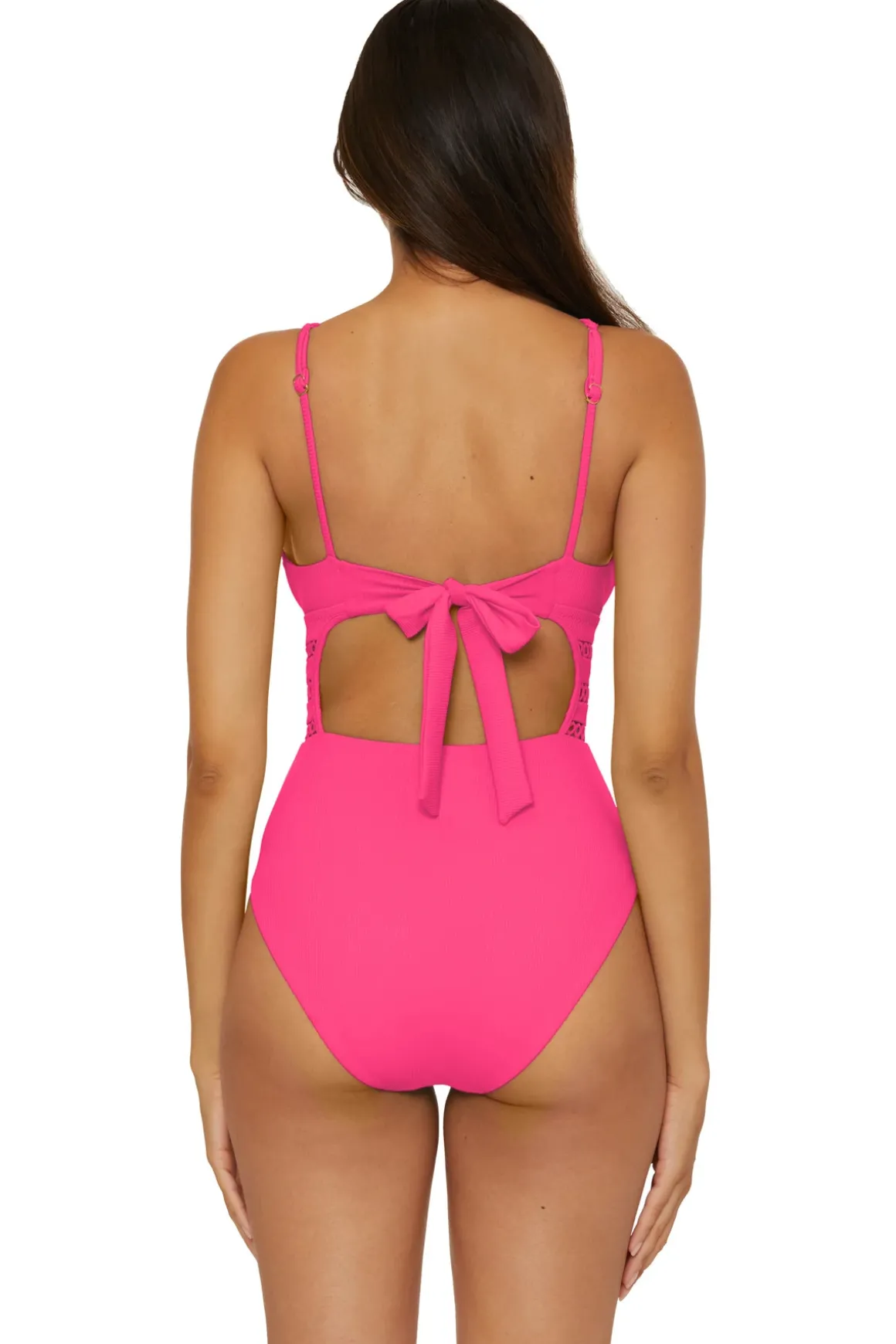 Toni one piece features fine ribbed texture and geometric cut-out trimming the neckline and bodice. Offers adjustable straps, removable soft cups, adjustable tie back, and moderate bottom coverage.