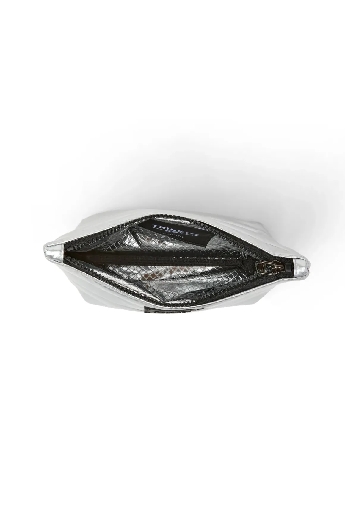 Pouches feature a quilted exterior, lined with a silver foil finish, rubber patch on the front, and a top zipper closure.