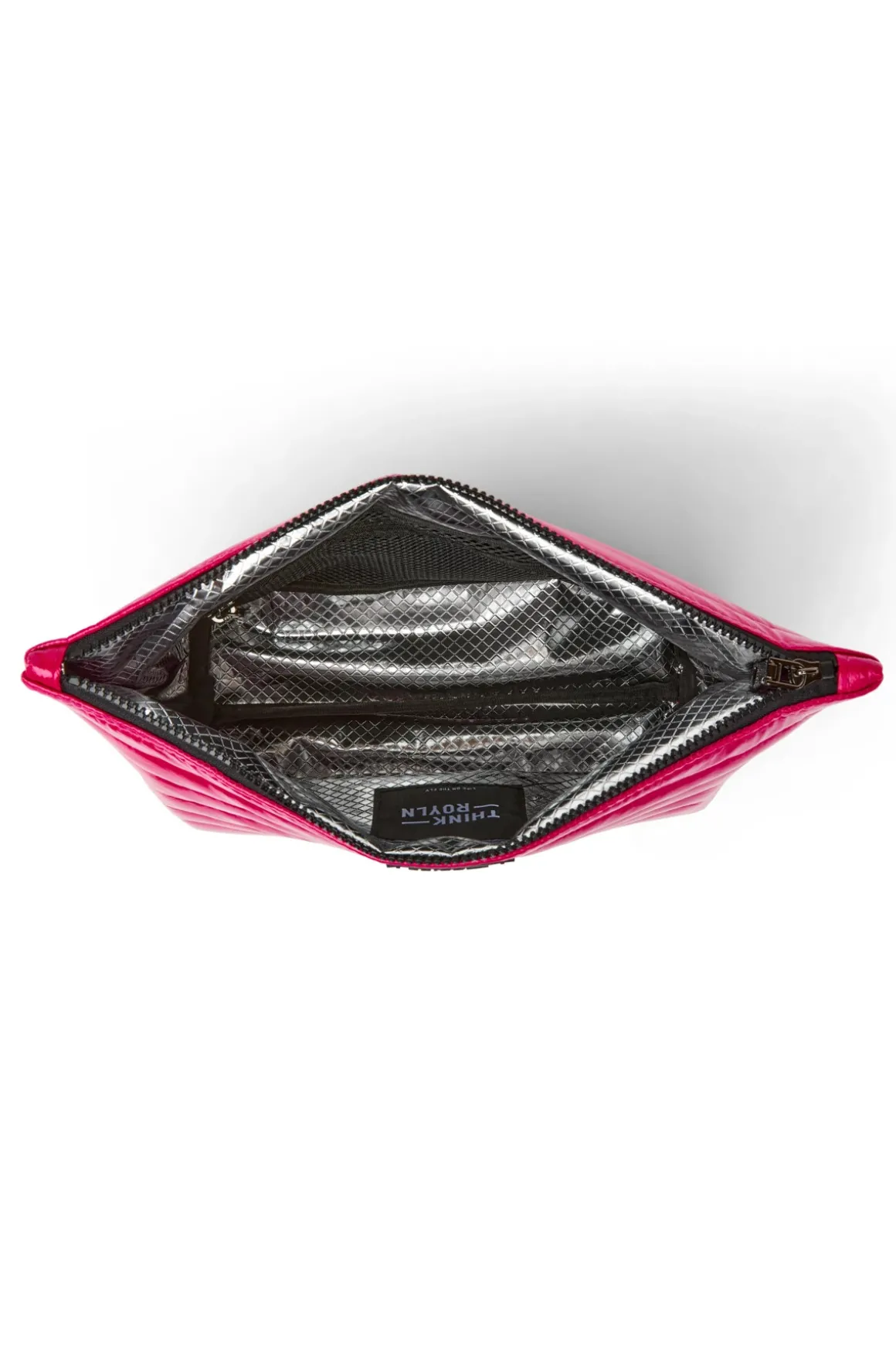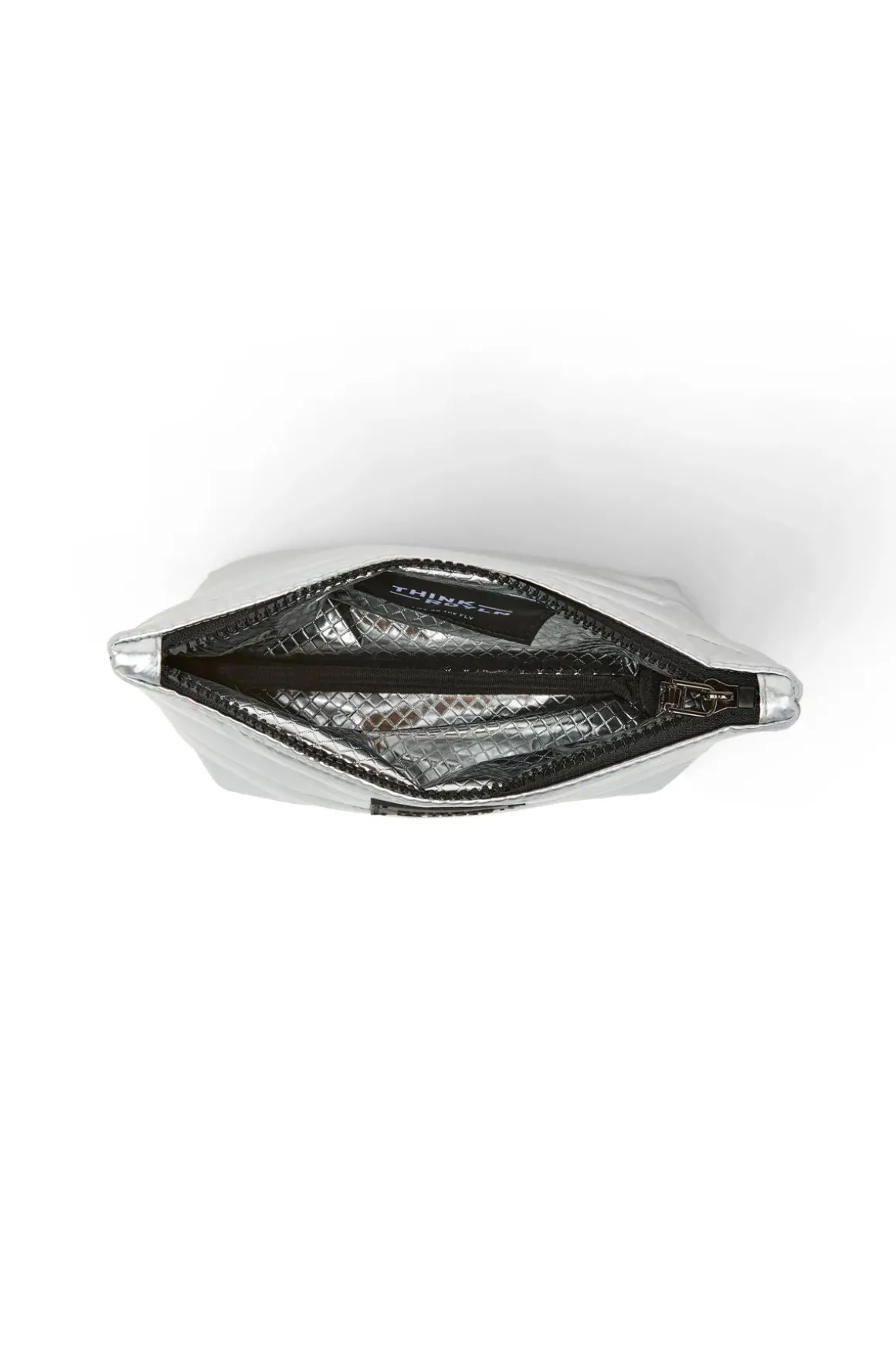 Pouches feature a quilted exterior, lined with a silver foil finish, rubber patch on the front, and a top zipper closure.