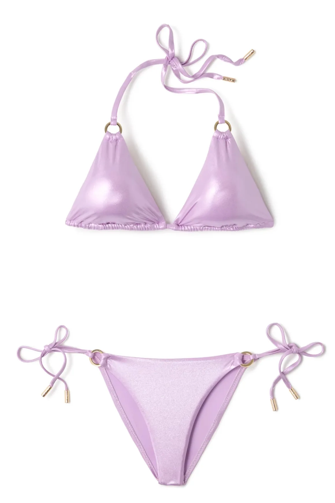 Triangle bikini top features metallic fabric and offers removable soft cups and adjustable neck and back ties.