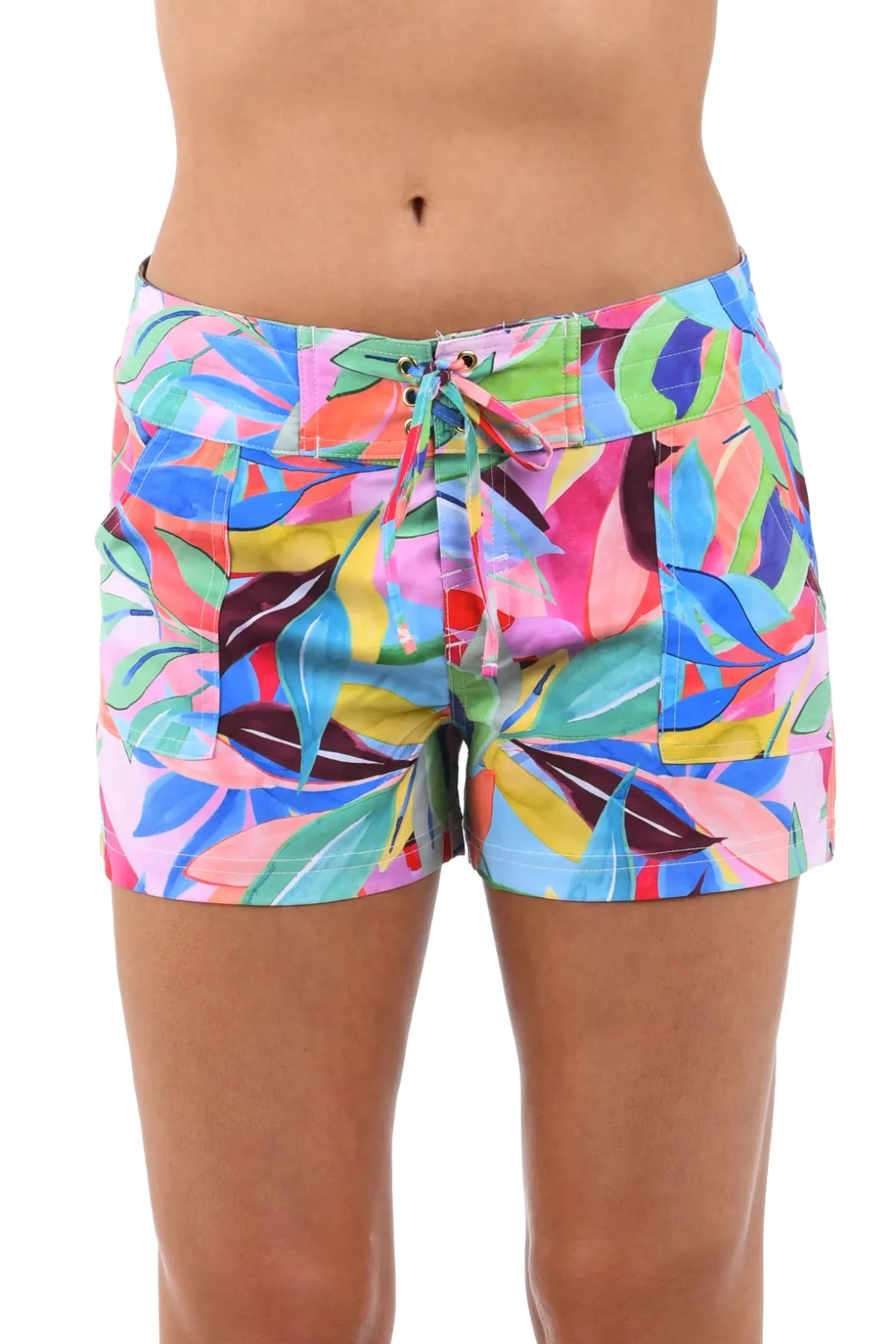 Board shorts feature a bright tropical print, lace-up front and patch pockets.