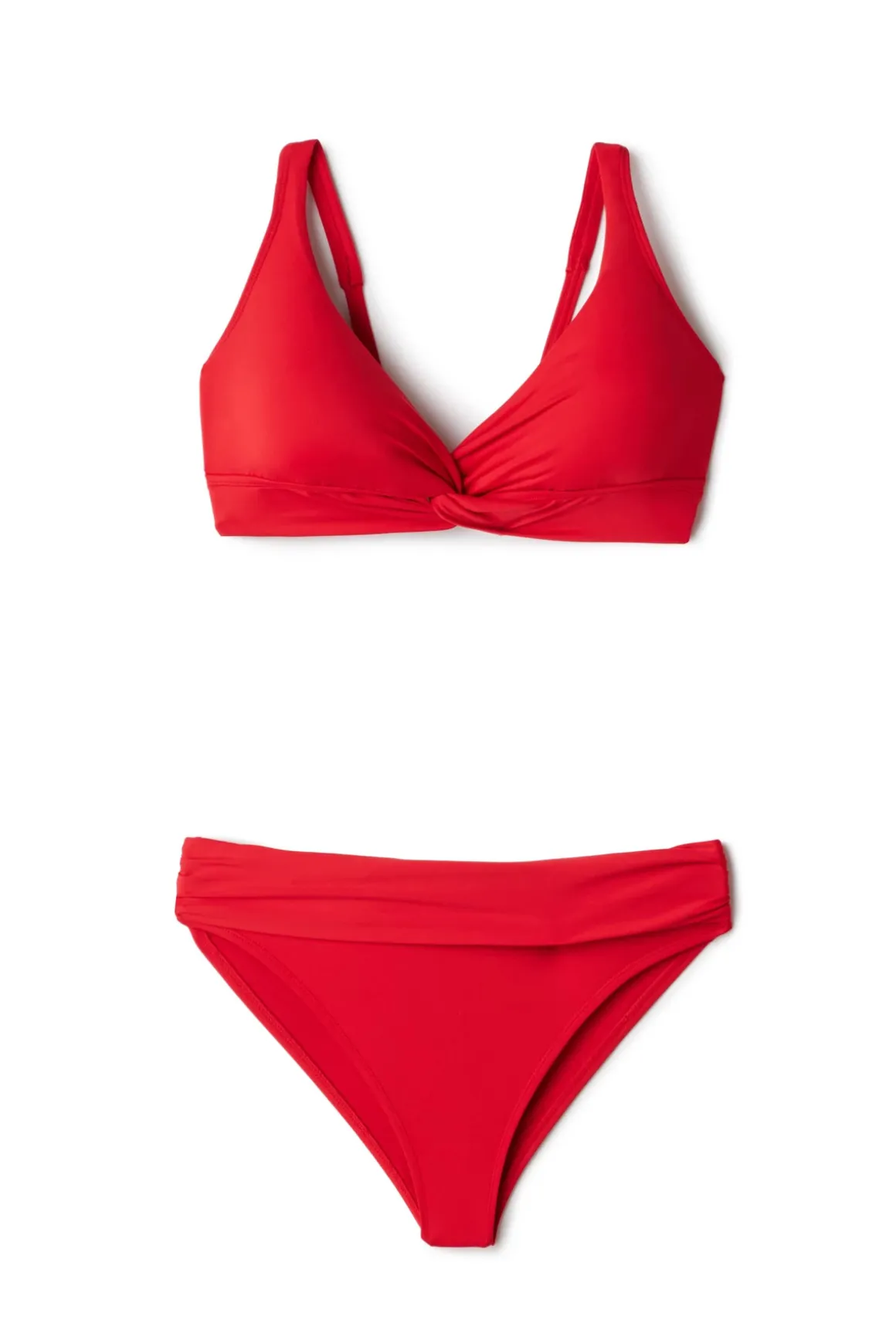 Bralette bikini top features a twist front with a v-wire, adjustable straps and removable soft cups.