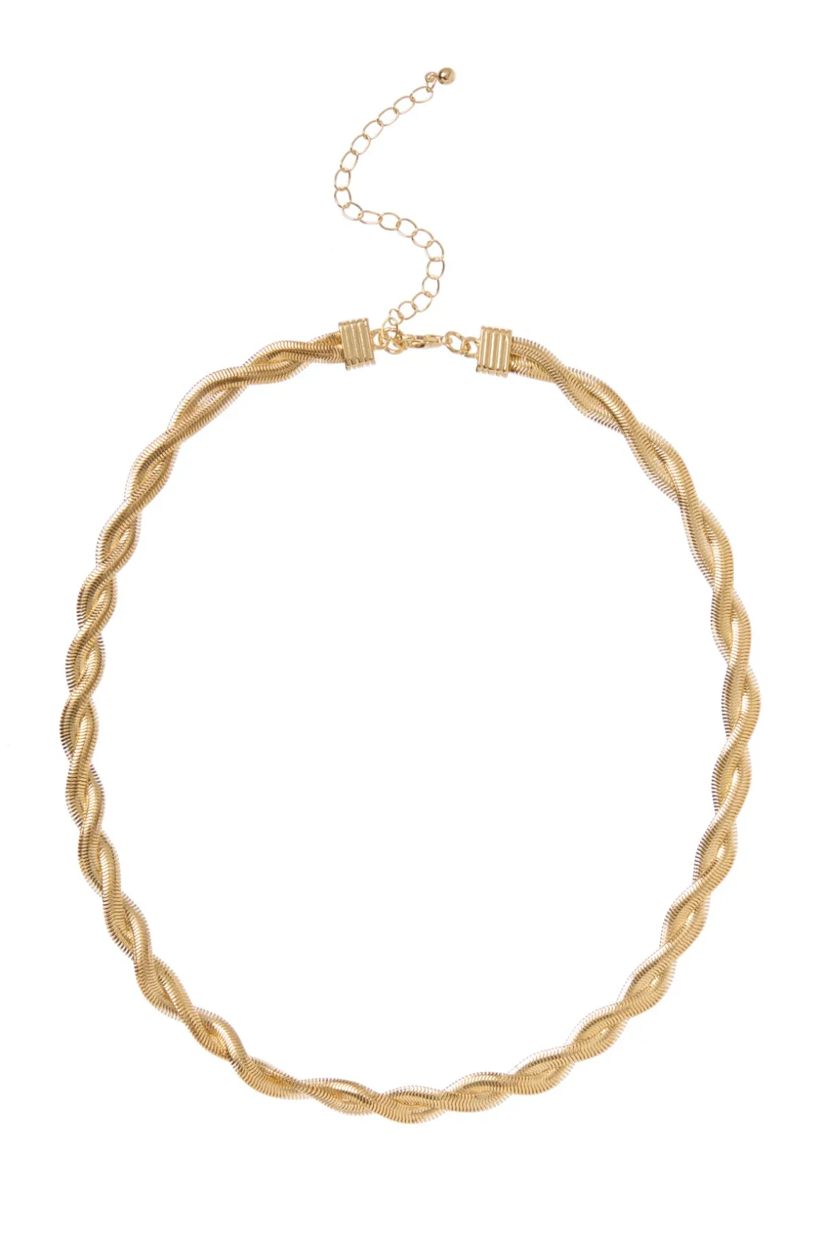 Necklace features a gold plated twisted chain and a clasp back closure.