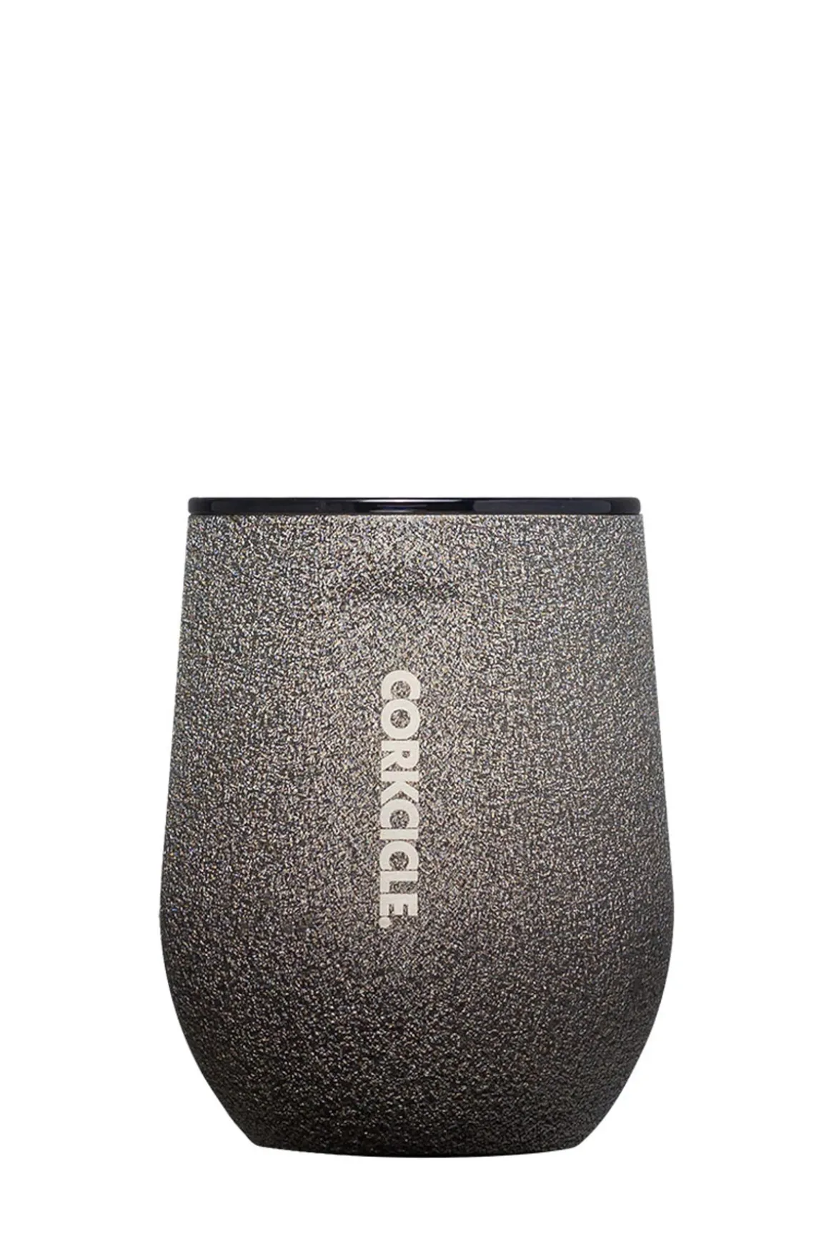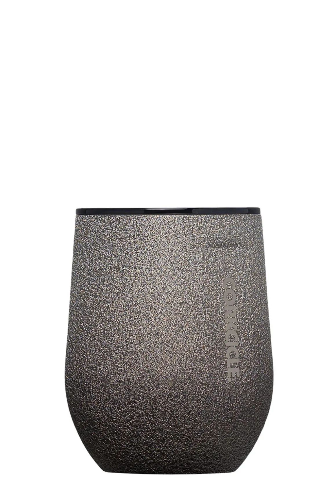 Sparkly stemless cup features a triple insulated 12oz stainless steel cup with a sliding shatter proof lid. Offers easy grip flat sides, and a non-slip silicone bottom. Keeps things cold for 6 hours, hot for 3 hours.