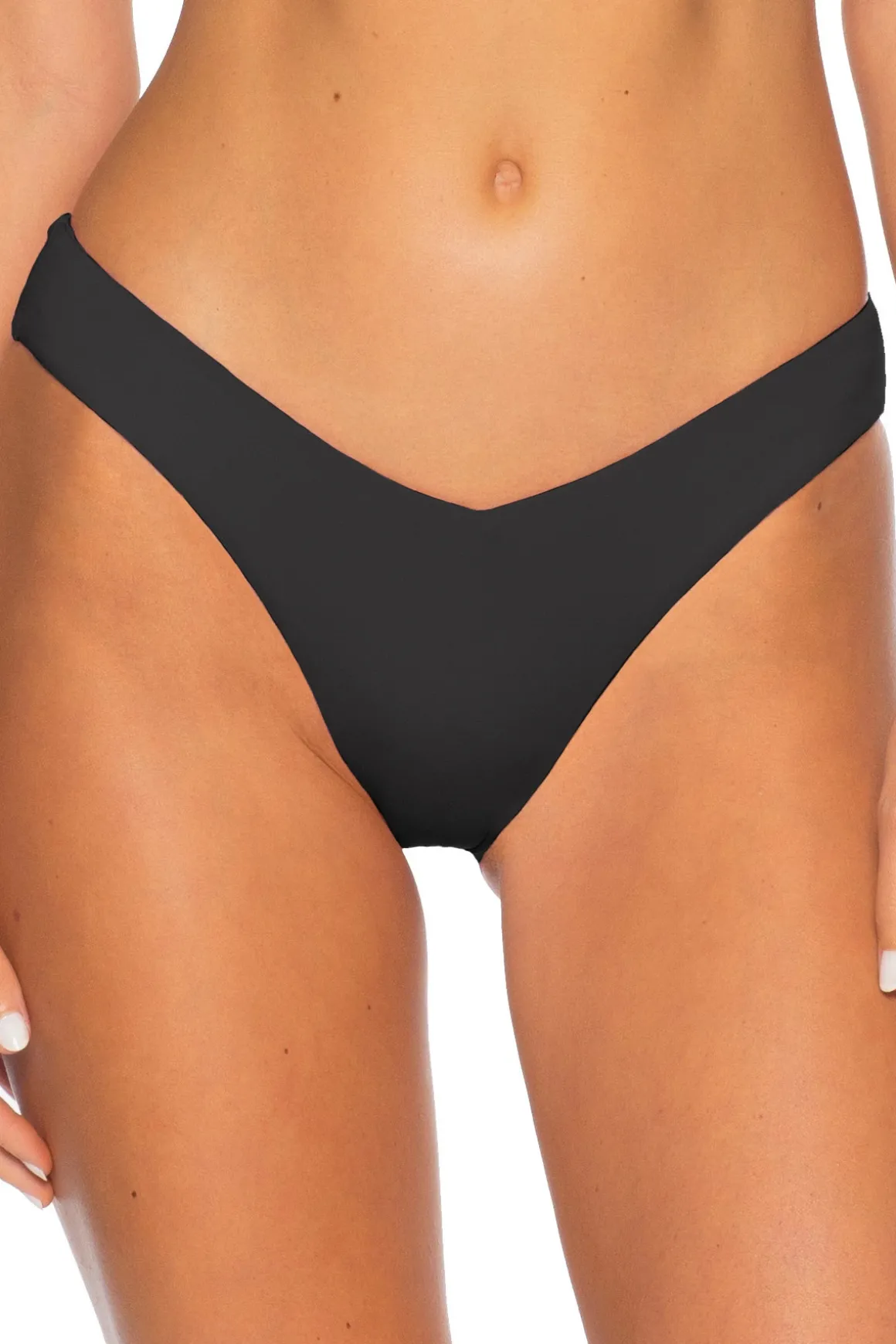 V-Front brazilian bikini bottom features a high leg cut and cinched back. Offers skimpy coverage.