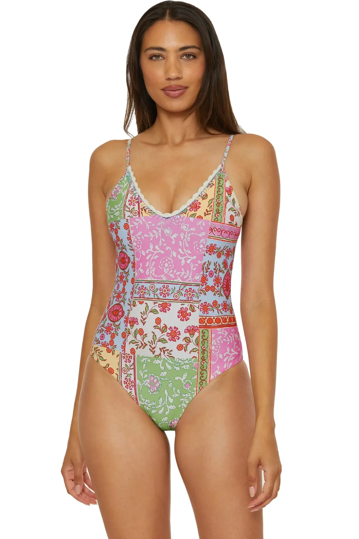One piece swimsuit features floral patchwork print, v-neckline with scalloped crochet trim and blanket stitch. Offers removable cups, adjustable shoulder straps and tie back closure.