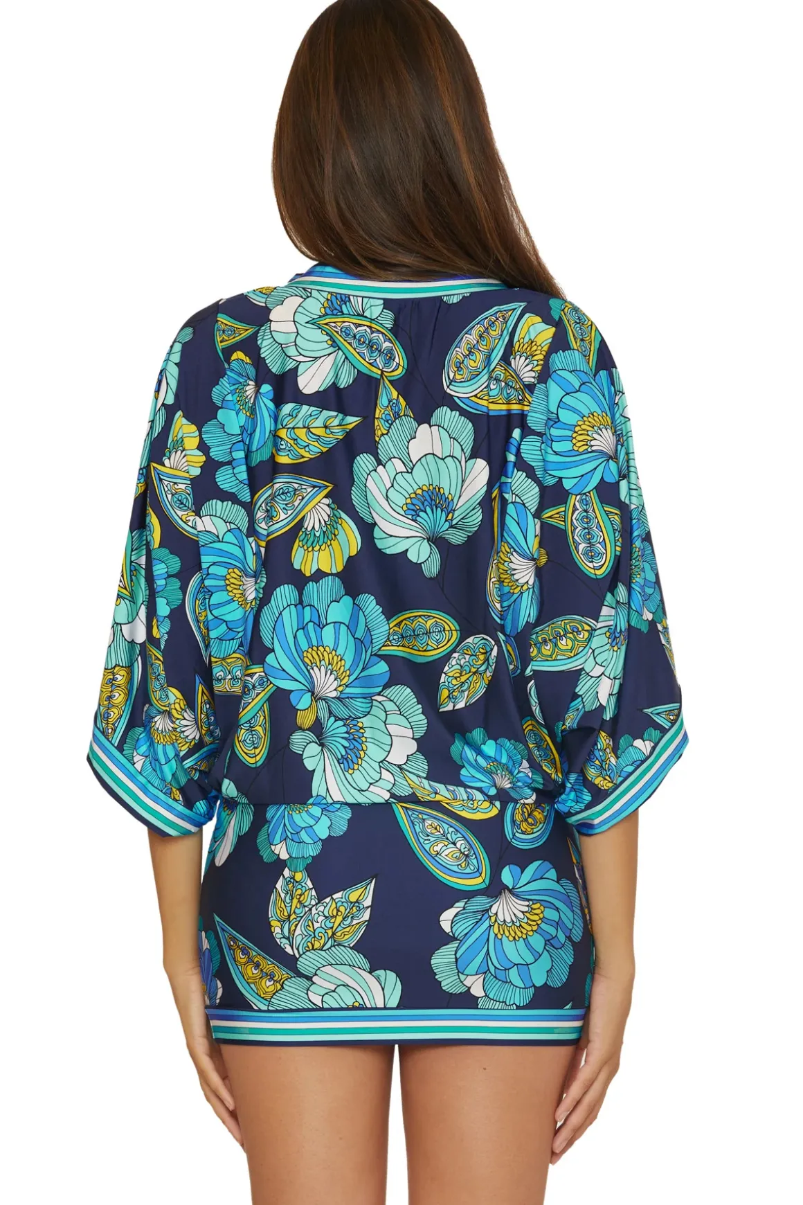 Tunic features a paisley floral print with contrast striped border along the wide 3/4 sleeves, v-neckline and hem.