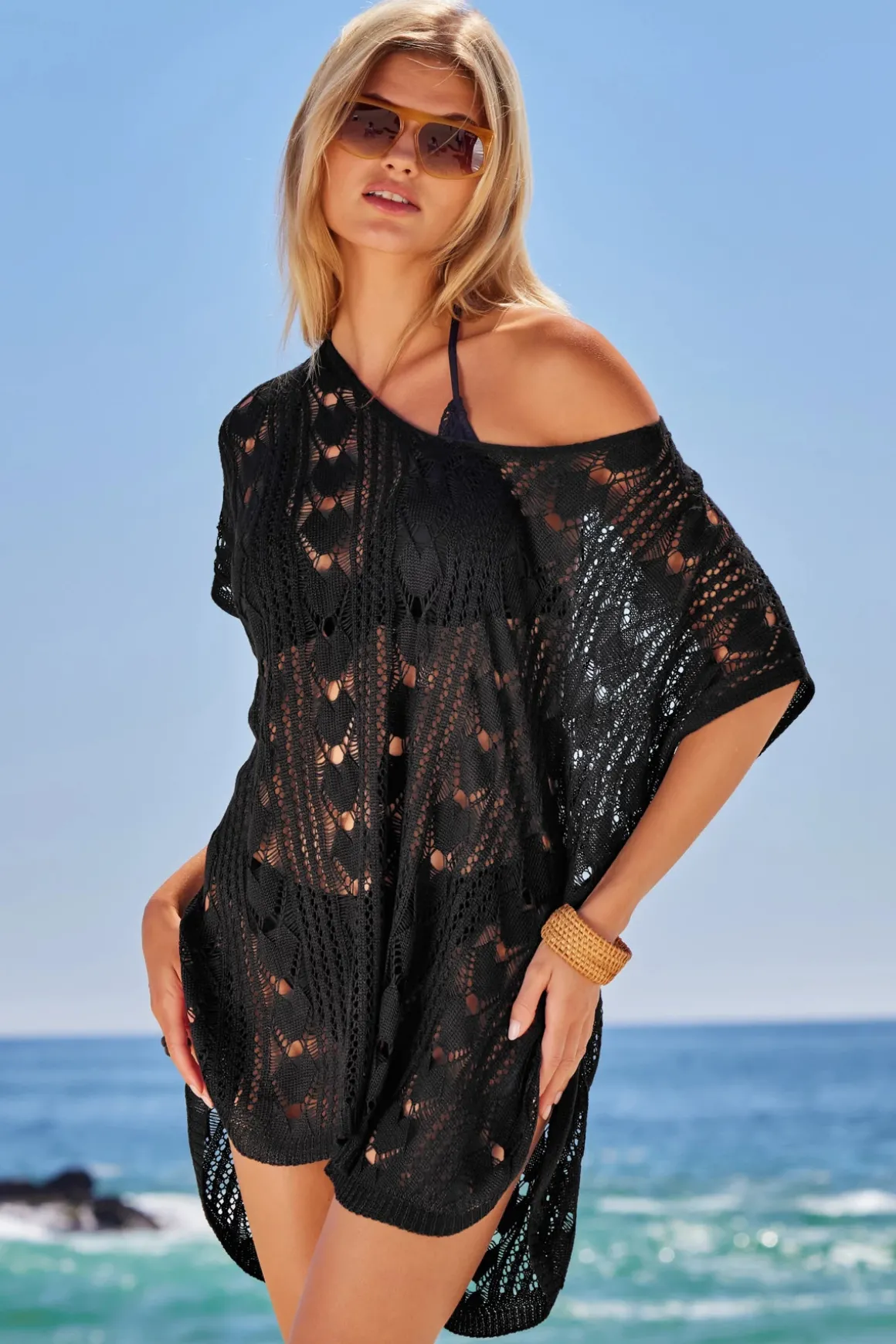Venica tunic features intricate open weave crochet, a high-low hem and short sleeves.