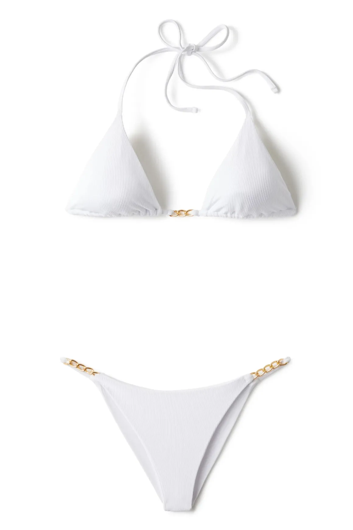 Ventura brazilian bikini bottom features ribbed fabric, chain tab sides, and skimpy coverage.