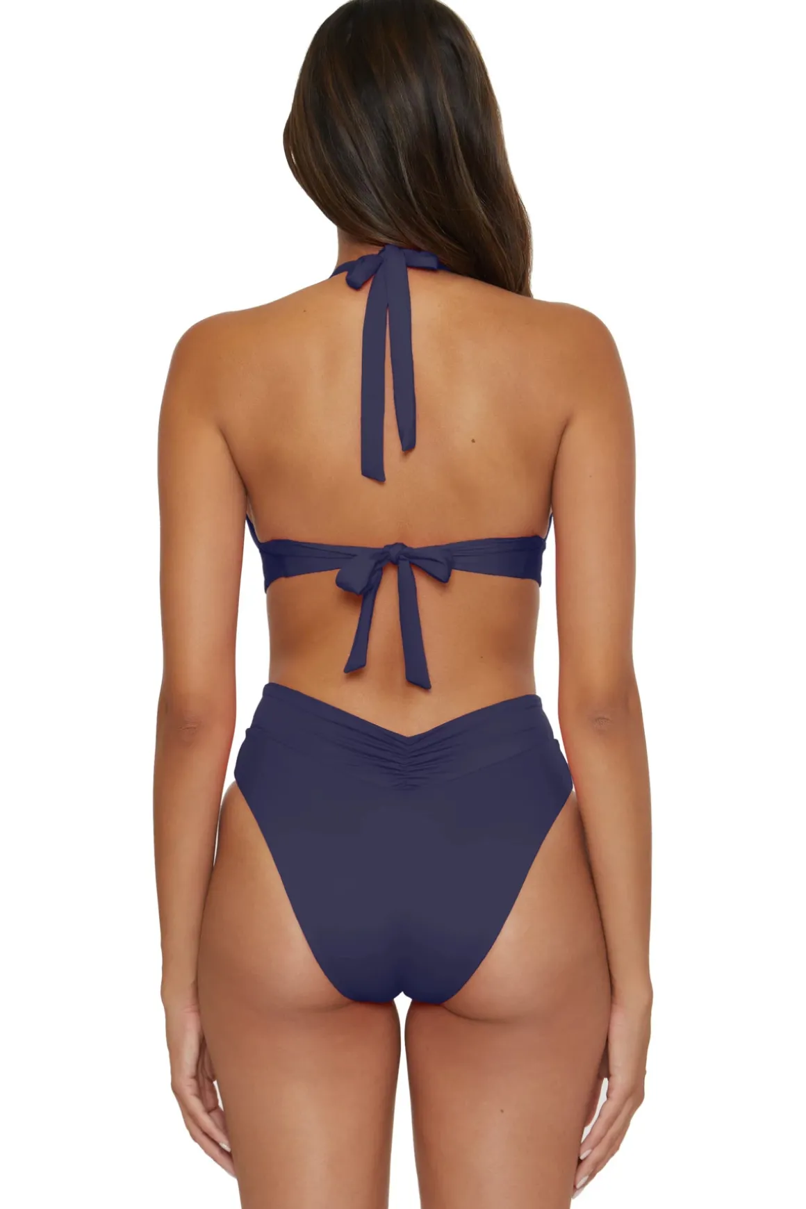 Viviana bikini top features a v-wire detail with shirring and offers a wide underbust band, removable soft cups, and adjustable neck and back ties.