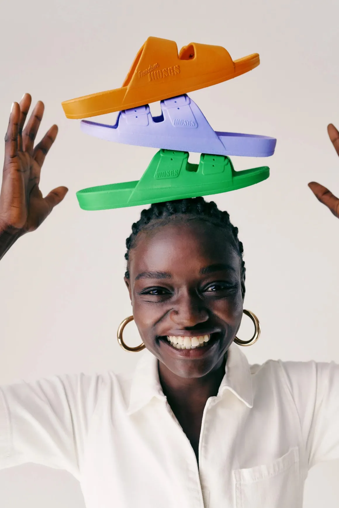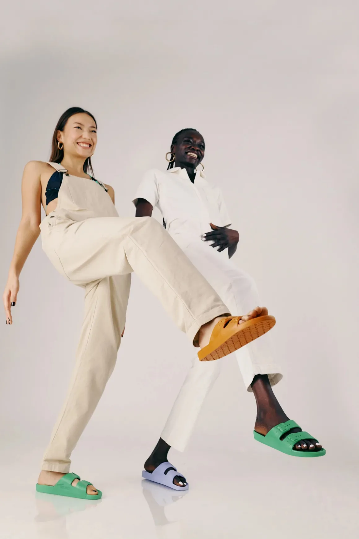 Waterproof Slides are vegan and recyclable slides that are injected with air and feature double wide crossover straps with faux buckles.