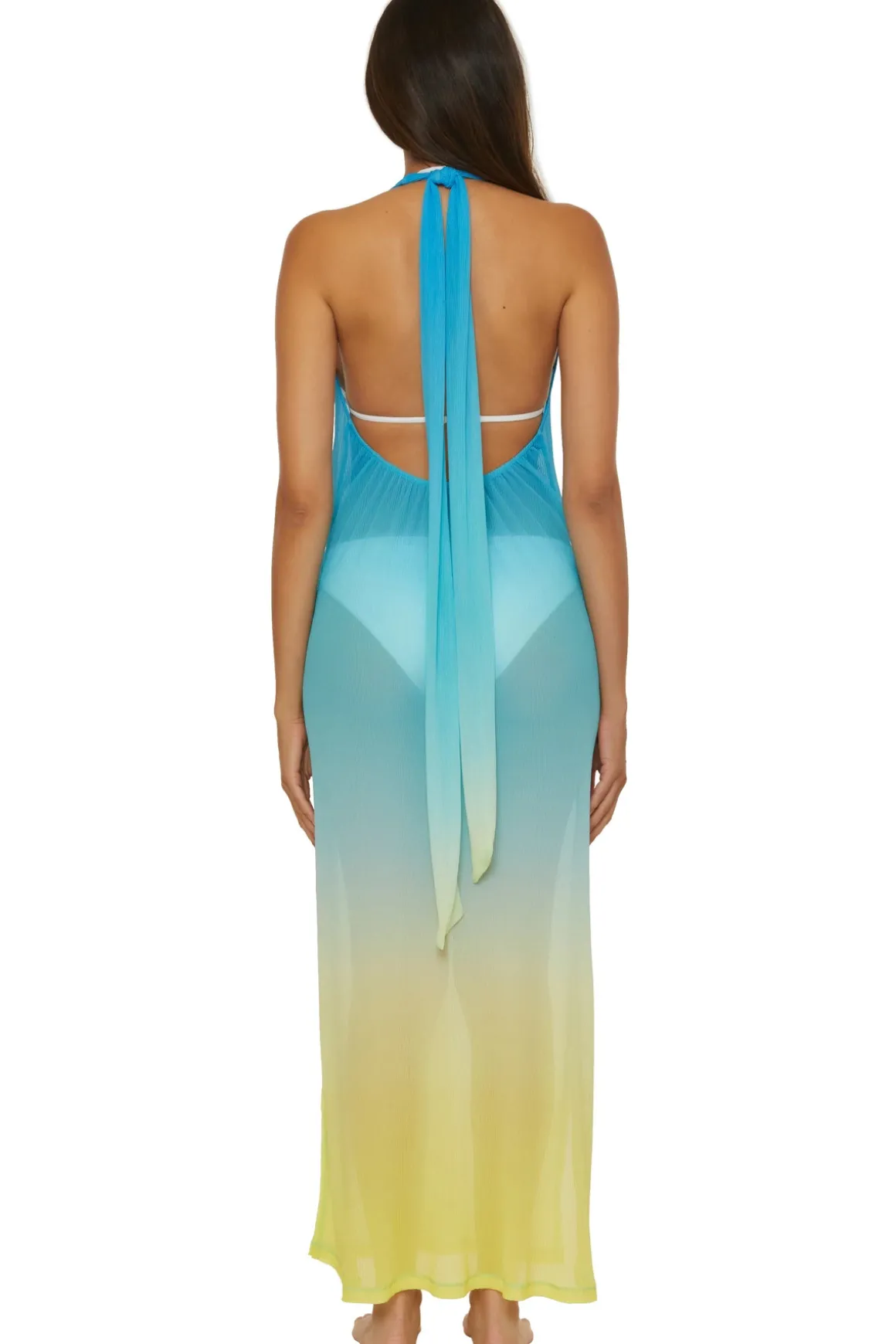 Sleeveless mesh maxi dress features ombre print, deep v-neckline, side slits and exaggerated long halter ties that drape down the back.