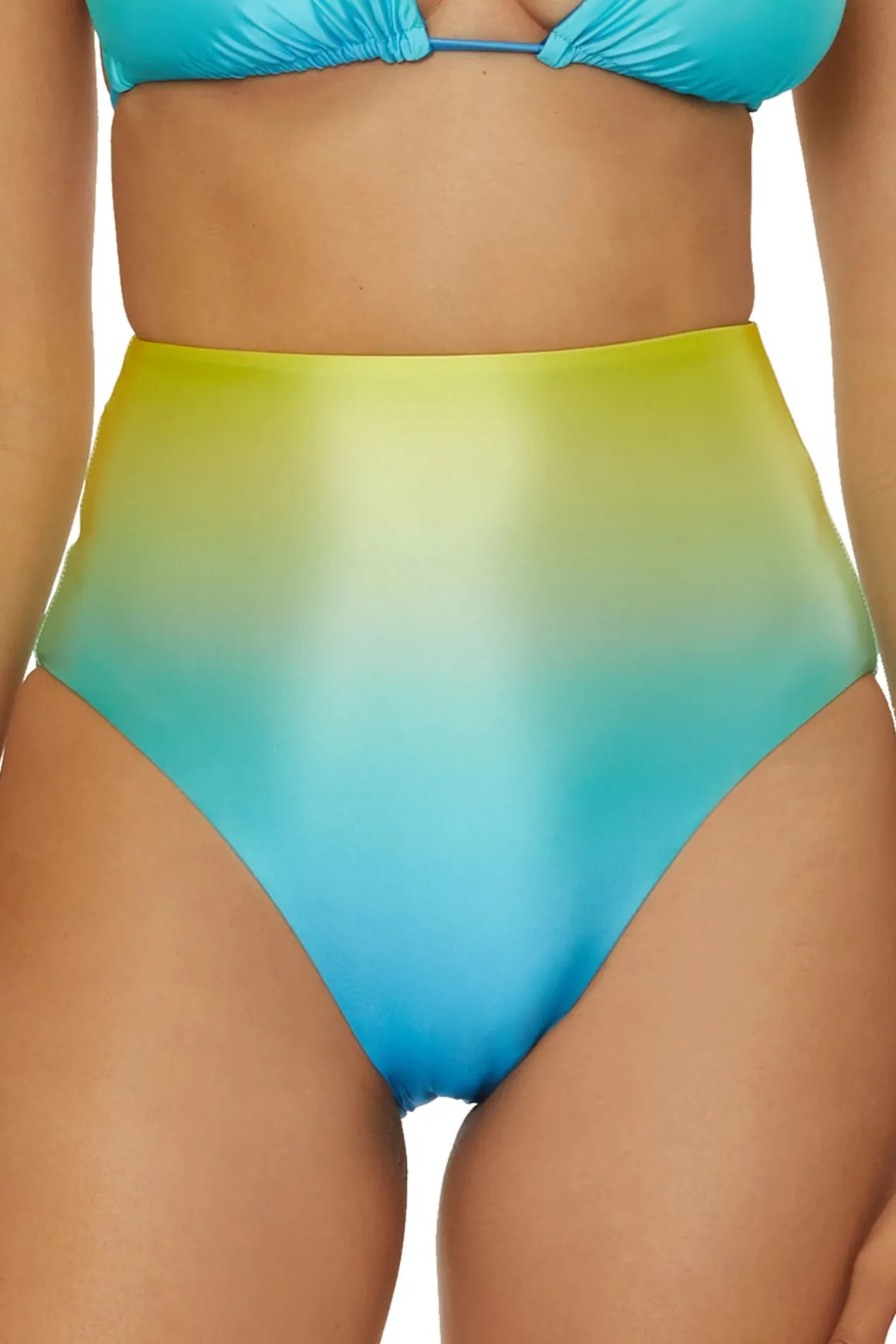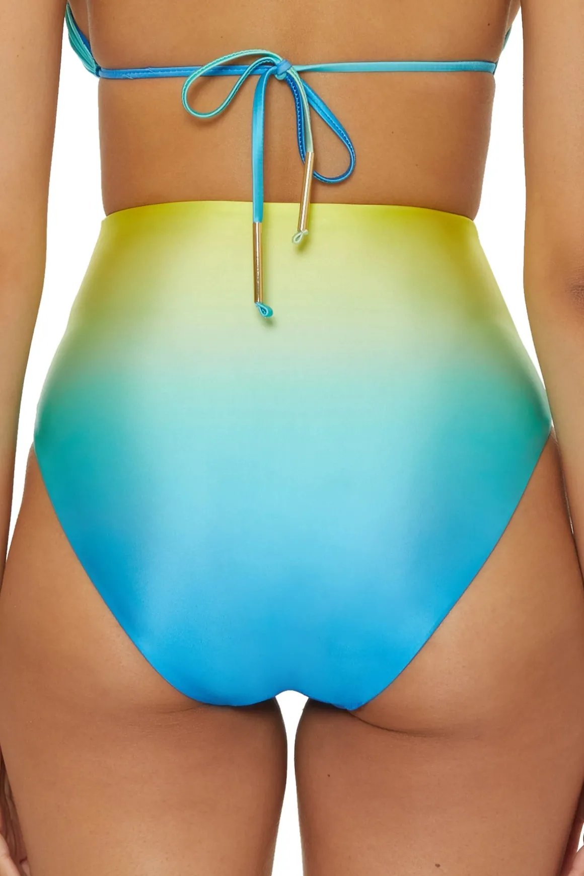 Bikini bottom features ombre high-shine liquid fabric that reverses to a solid and moderate bottom coverage.