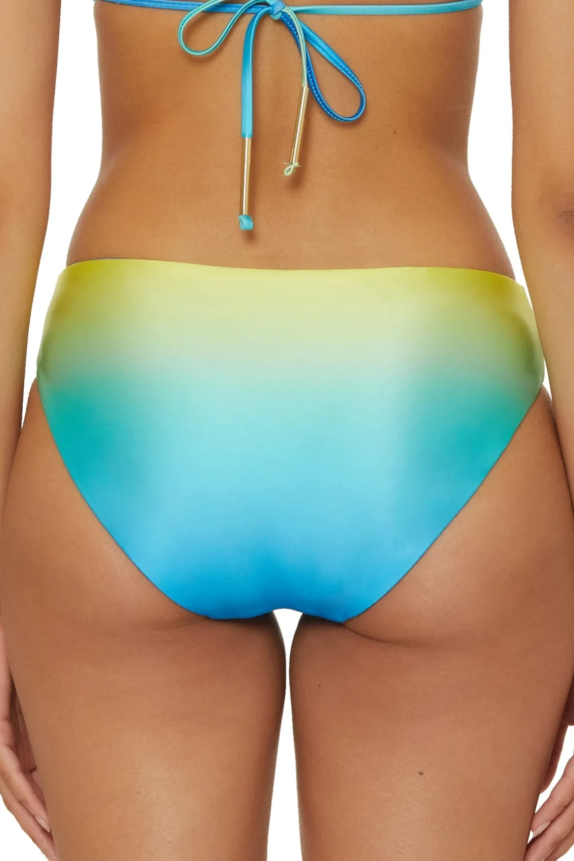 Bikini bottom features ombre high-shine liquid fabric that reverses to a solid and moderate bottom coverage.