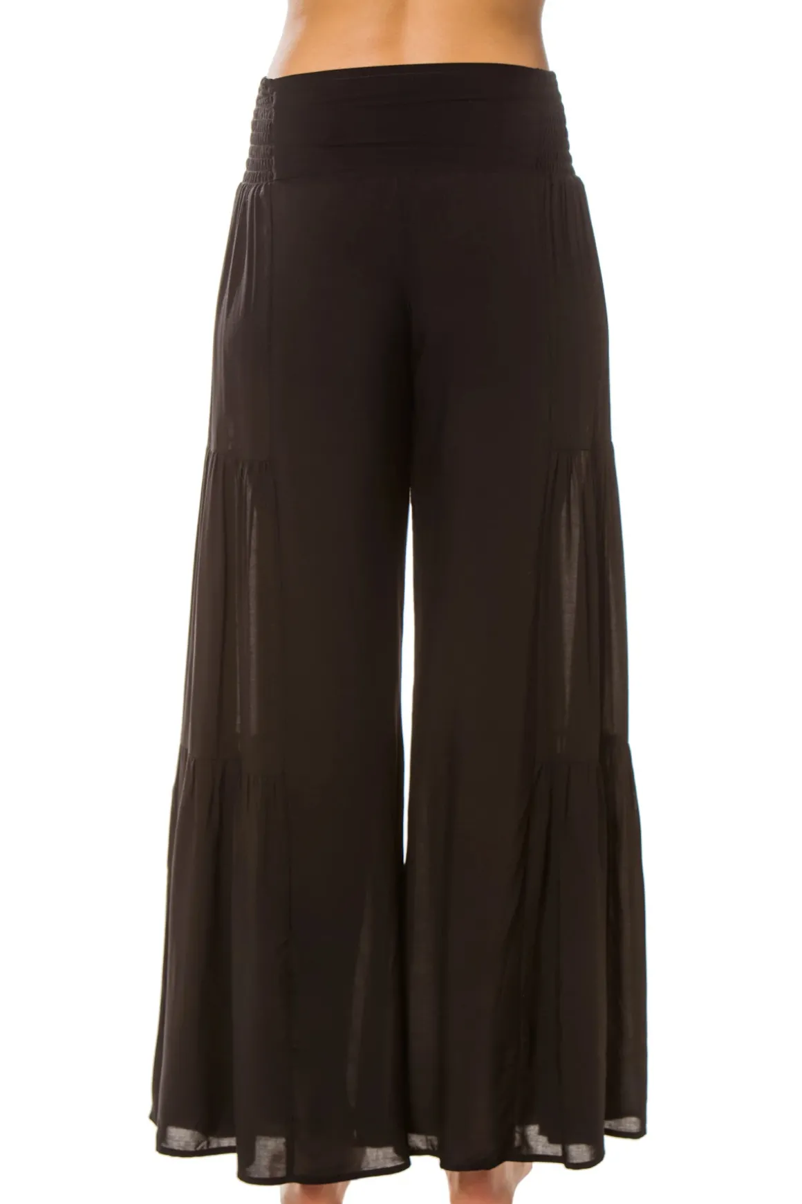 Wide leg tiered pants with oversize bow tie at waist and smocked panels.
